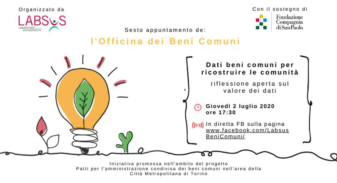 Una riflessione aperta sul valore dei dati è il tema del sesto appuntamento de “L’Officina dei Beni Comuni”, evento organizzato da Labsus nell’ambito del progetto “Patti per l’amministrazione condivisa nell’area metropolitana di Torino” con il sostegno di Fondazione Compagnia di San Paolo.