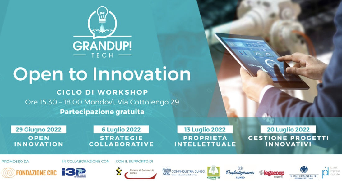 ll progetto GrandUP! Tech, nato dalla collaborazione tra Fondazione CRC e I3P, comprende una serie di attività rivolte all’ambito dell’Open Innovation, uno strumento sempre più diffuso e utilizzato nel rispondere ai processi di trasformazione delle tecnologie e dei modelli di business. Soprattutto nella prospettiva delle PMI e delle grandi aziende, infatti, le collaborazioni con le startup innovative stanno diventando una risorsa strategica di crescente importanza nelle attività di innovazione collaborativa, basata sull’accesso a idee, competenze e know-how esterne al perimetro delle imprese.