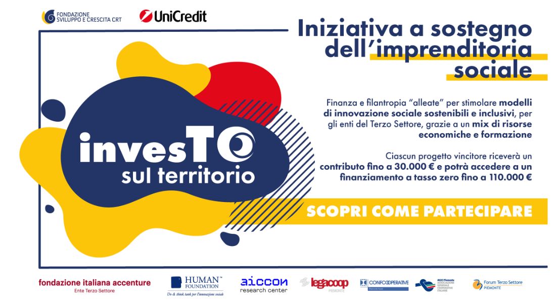 “InvesTO sul territorio” è realizzato da UniCredit e Fondazione Sviluppo e Crescita CRT in collaborazione con Fondazione Italiana Accenture ETS, in partnership con Confcooperative Piemonte Nord, Legacoop Piemonte, AGCI Piemonte (Associazione Generale delle Cooperative Italiane), Forum del Terzo Settore in Piemonte e con il supporto tecnico-scientifico di AICCON Research Center e Human Foundation.