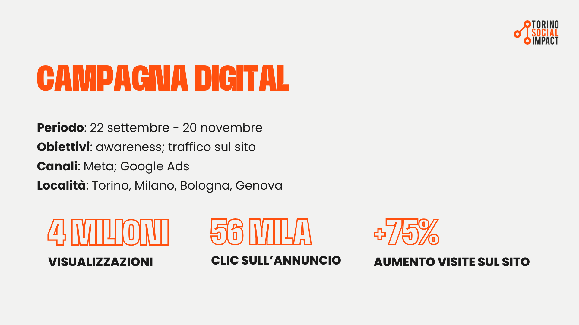 La campagna è stata diffusa in una prima fase dal 20 settembre a metà novembre a Torino, attraverso affissioni e pubblicità dinamica sui tram. In parallelo è stata avviata una promozione digitale con target su Torino, Milano, Bologna e Genova, città con cui è già attivo un dialogo sul tema, con l’obiettivo di evidenziare l’importanza della collaborazione tra ecosistemi territoriali e rafforzare il posizionamento di Torino come “uno dei migliori posti al mondo per fare impresa e finanza di impatto”, come recita lo slogan che accompagna Torino Social Impact fin dai suoi primi passi.