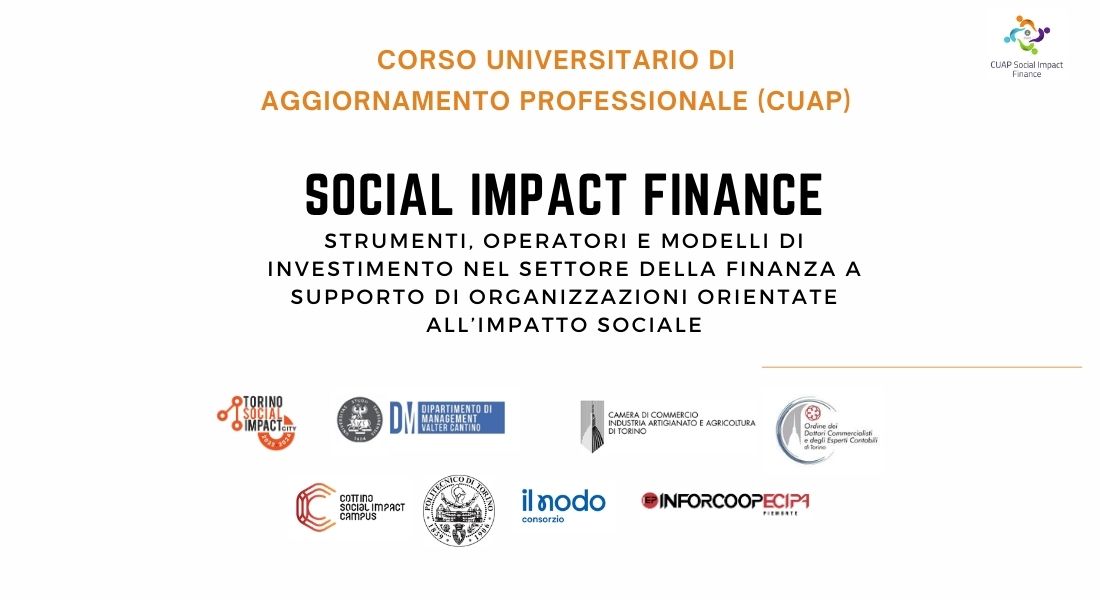 MailIl nuovo Corso Universitario di Aggiornamento Professionale (CUAP) Social Impact Finance è rivolto a coloro che intendono potenziare conoscenze e competenze sul tema della finanza sostenibile e dell’impact investing. Il corso universitario, coordinato dal prof. Paolo biancone, è realizzato dal Dipartimento di Management “Valter Cantino” dell’Università degli Studi di Torino, in collaborazione con Torino Social Impact, Politecnico di Torino, Cottino Social Impact Campus, Camera di commercio di Torino, e con le agenzie di formazione del sistema cooperativo Inforcoop Ecipa Piemonte e il Consorzio Il Nodo.