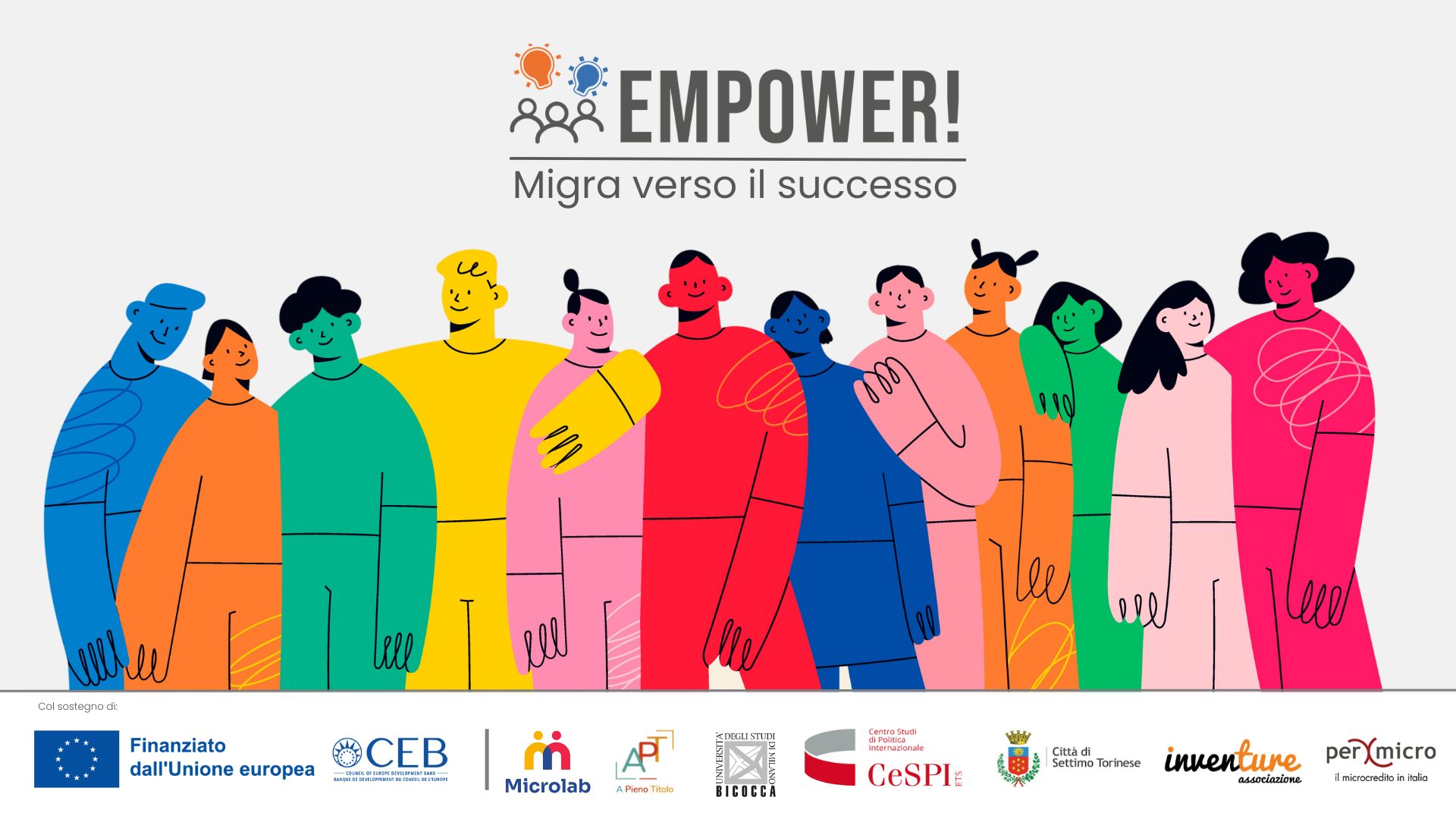 Empower! – Migrants in Professional Welfare & Economic Rights è un progetto finanziato nell’ambito di un accordo più ampio tra la Council of Europe Development Bank, (CEB) e la Commissione europea (Direzione generale degli Affari interni), il cui scopo è migliorare l’inclusione dei migranti negli Stati membri dell’UE attraverso lo sviluppo di nuovi partenariati e nuove forme di finanziamento. Empower è un progetto realizzato grazie al contributo ad un partenariato pubblico privato composto dall’Associazione Microlab, ente capofila, A pieno titolo, Università di Milano-Bicocca, CeSPI Centro Studi di Politica Internazionale, Comune di Settimo Torinese, Inventure aps, PerMicro, in collaborazione col Comune di Torino e OIM, Organizzazione Internazionale per le Migrazioni.