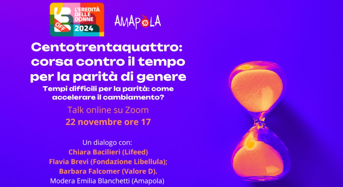 134 years: that’s how long the Global Gender Gap Report from the World Economic Forum estimates it will take to reach global gender equality. This daunting number highlights the long road ahead. But rather than resigning ourselves to the wait, it’s urgent to reflect on the strategies, actions, and policies needed to bridge this gap more swiftly. To do so, we must rethink the roles that both women and men will play in driving this cultural shift. On Friday, November 22 at 5:00 PM, as part of the off-schedule program of L’eredità delle donne festival and in the lead-up to the International Day for the Elimination of Violence Against Women, Amapola is hosting an online talk to reflect on the path toward gender equality.