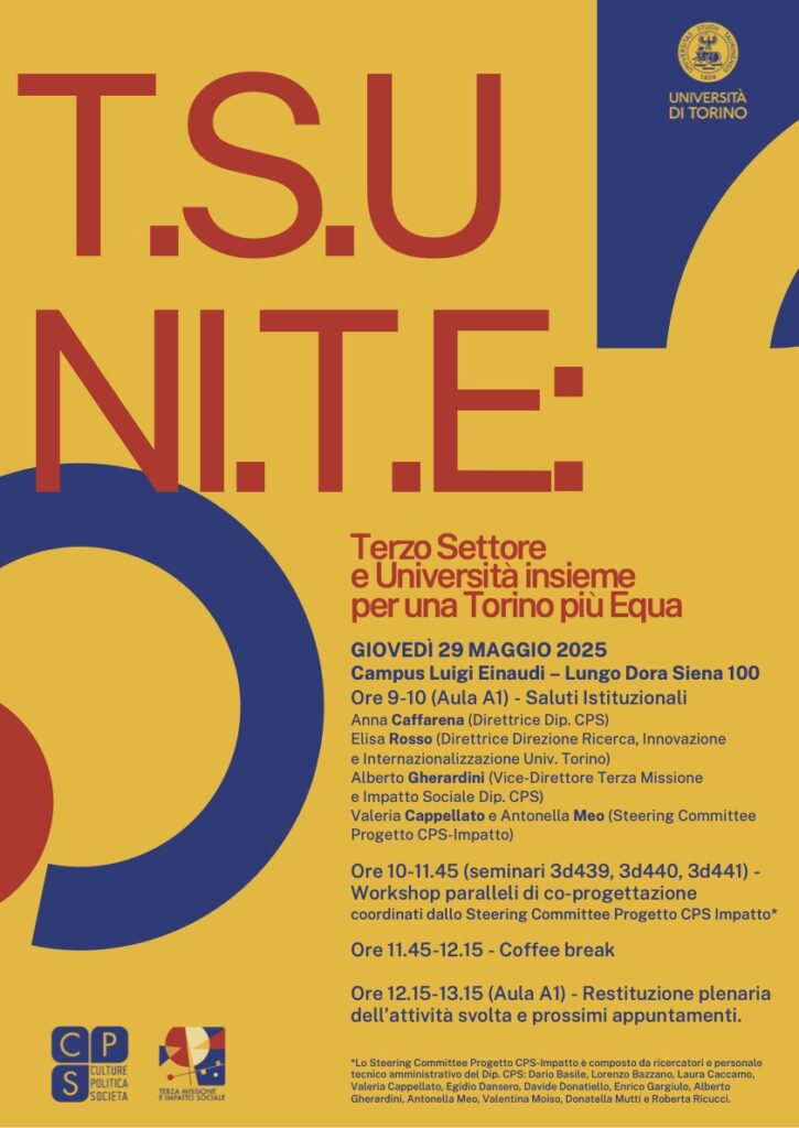 The Department of Cultures, Politics and Society at the University of Turin is organizing “TSUNITE: Third Sector and University Together for a More Equitable Turin”, a key event fostering collaboration between academia and local organizations. The event will take place on Thursday, May 29, 2025, from 9:00 AM to 1:30 PM at the Einaudi Campus.