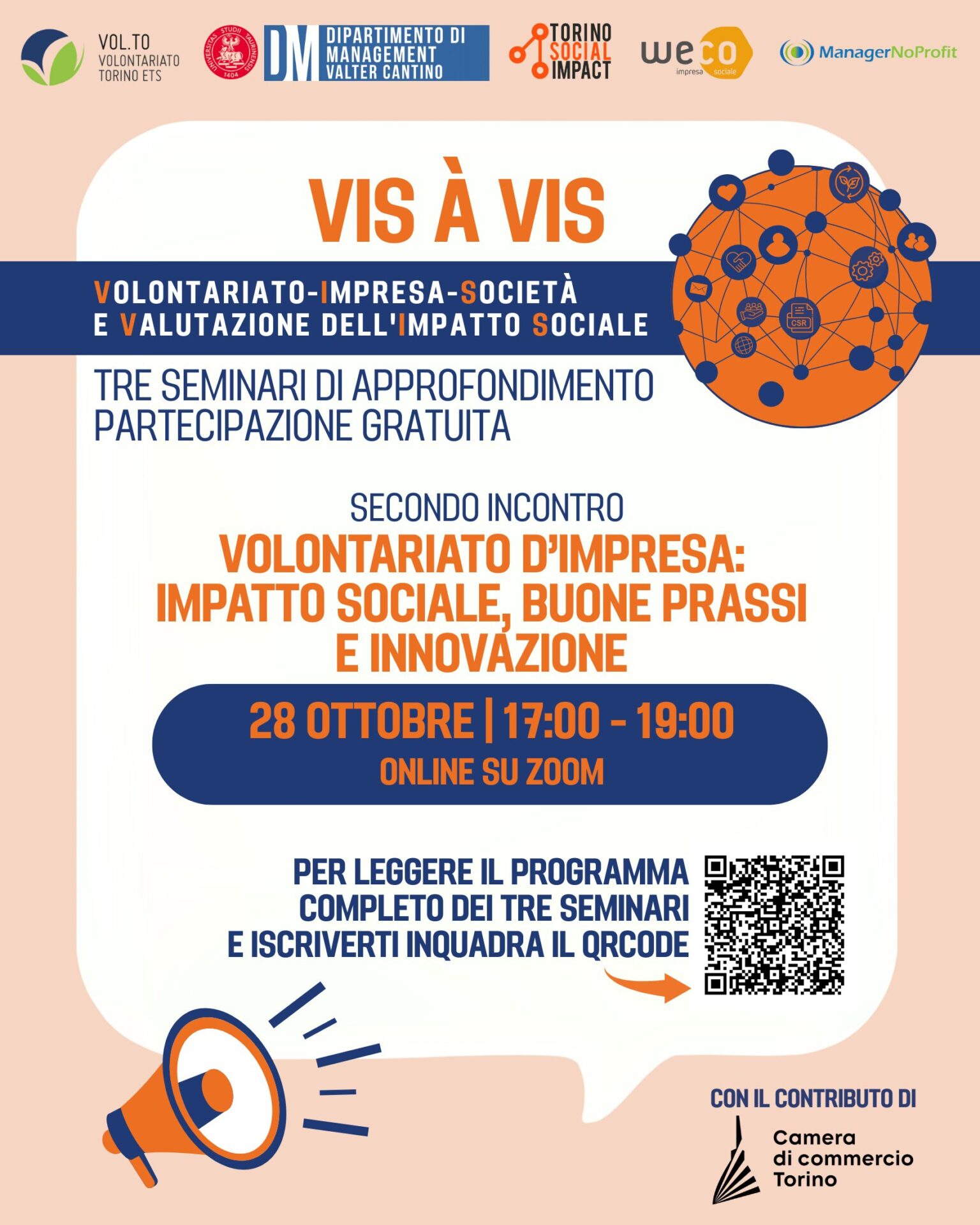 Martedì, 11 novembre dalle 17 alle 19:30, presso il Cottino Social Impact Campus in Corso Castelfidardo 30/A a Torino, si terrà il terzo e ultimo incontro del ciclo di seminari dedicati al Volontariato d’impresa realizzato nell’ambito del progetto VIS À VIS.