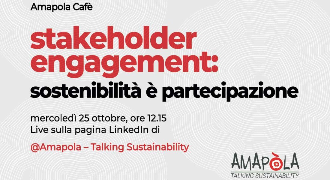 Sostenibilità è partecipazione. L’azione di un’impresa che si fonda sui criteri di sostenibilità oggi poggia inevitabilmente anche sullo stakeholder engagement, per ridurre le distanze e raggiungere attraverso il coinvolgimento i propri obiettivi ESG – ambientali, sociali e di governance. Per approfondire questo tema sempre più nevralgico, mercoledì 25 ottobre alle ore 12.15 la società di consulenza Amapola, specializzata in sostenibilità e comunicazione, organizza sulla sua pagina LinkedIn un Amapola Cafè dedicato allo stakeholder engagement e management.