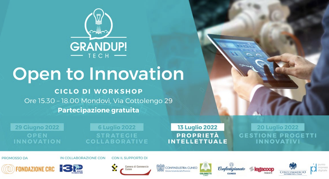 GrandUP! Tech è il progetto che Fondazione CRC ha avviato in collaborazione con I3P, l’Incubatore del Politecnico di Torino, per contribuire allo sviluppo dell’ecosistema dell’innovazione e dell’imprenditorialità innovativa sul territorio di Cuneo. Il progetto comprende una serie di attività rivolte all’ambito dell’Open Innovation, uno strumento sempre più diffuso e utilizzato nel rispondere ai processi aziendali di trasformazione delle tecnologie e dei modelli di business. Il percorso gratuito “Open to Innovation”, articolato in quattro workshop tematici tra giugno e luglio 2022 presso la sede di Mondovì del Politecnico di Torino, affronta le tematiche fondamentali per l’impostazione e l’avvio dei progetti innovativi in azienda, le strategie di innovazione collaborativa e le metodologie più adatte per proteggere la proprietà intellettuale, attraverso gli interventi di docenti, esperti di settore e imprese del territorio.