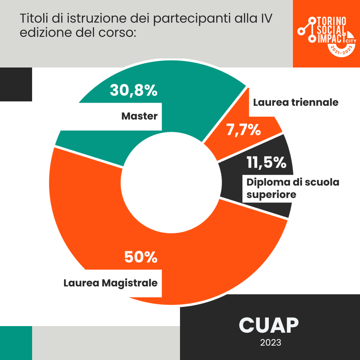 Un altro punto rilevante è quello relativo al livello e al titolo di istruzione: il 50% possiede una Laurea magistrale, mentre il 30,8% ha già conseguito un Master.
