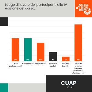 In merito agli ambienti lavorativi dai quali gli studenti provengono, il 40% è diviso equamente tra liberi professionisti e Cooperative. Il 16% sono Associazioni, l’8% Imprese Sociali. Compaiono quest’anno le Società Benefit con il 4%, mentre il resto è composto da aziende private, imprese pubbliche, start up, enti finanziari e fondi mutualistici.