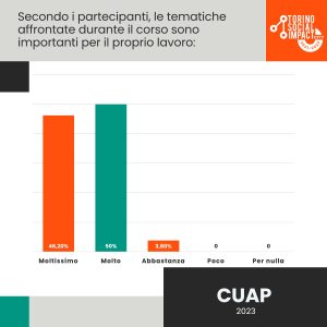 Circa le opinioni dei partecipanti sull’effettiva utilità del Corso, quanto emerso dalle risposte è di certo una conferma: quasi il 97% di loro sostiene l’importanza delle tematiche affrontate durante il corso all’interno del proprio ambito lavorativo.
