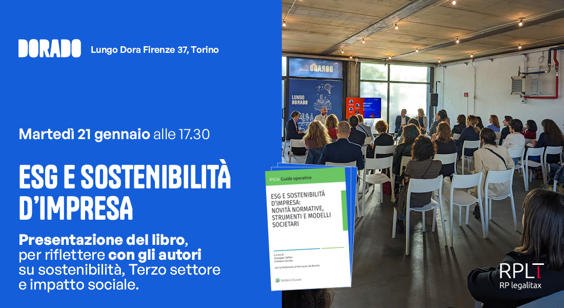 Martedì 21 gennaio alle 17.30 dentro Dorado (Lungo Dora Firenze 37) Stratosferica e RPLT RP legalitax vi aspettano per la presentazione del libro ESG e sostenibilità d’impresa – novità normative, strumenti e modelli societari, a cura di Giuseppe Taffari e Emiliano Giovine.