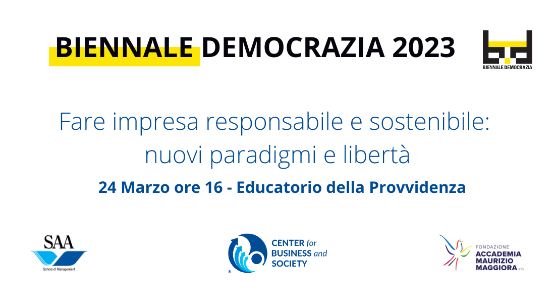 Venerdì 24 Marzo alle ore 16 presso l’Educatorio della Provvidenza in Corso Trento 13 – Torino, Fondazione Accademia M. Maggiora, ETS e LabNet, SAA – School of Management dell’Università di Torino propongono il seminario “FARE IMPRESA RESPONSABILE E SOSTENIBILE: NUOVI PARADIGMI E LIBERTÀ” che rientra nell’ambito della Biennale Democrazia, per approfondire, con docenti, rappresentanti del mondo delle imprese e del Terzo Settore nuove forme di impresa nell’ottica di quello che oggi possiamo definire “Istituzionalismo sostenibile e responsabile”.