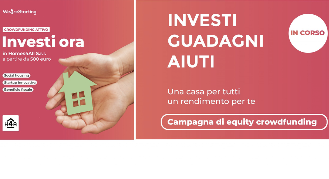 È attiva la nuova campagna di equity crowdfunding di Homes4All srl società benefit B Corp sulla piattaforma WeAreStarting per favorire la rigenerazione urbana contrastando l’emergenza abitativa.