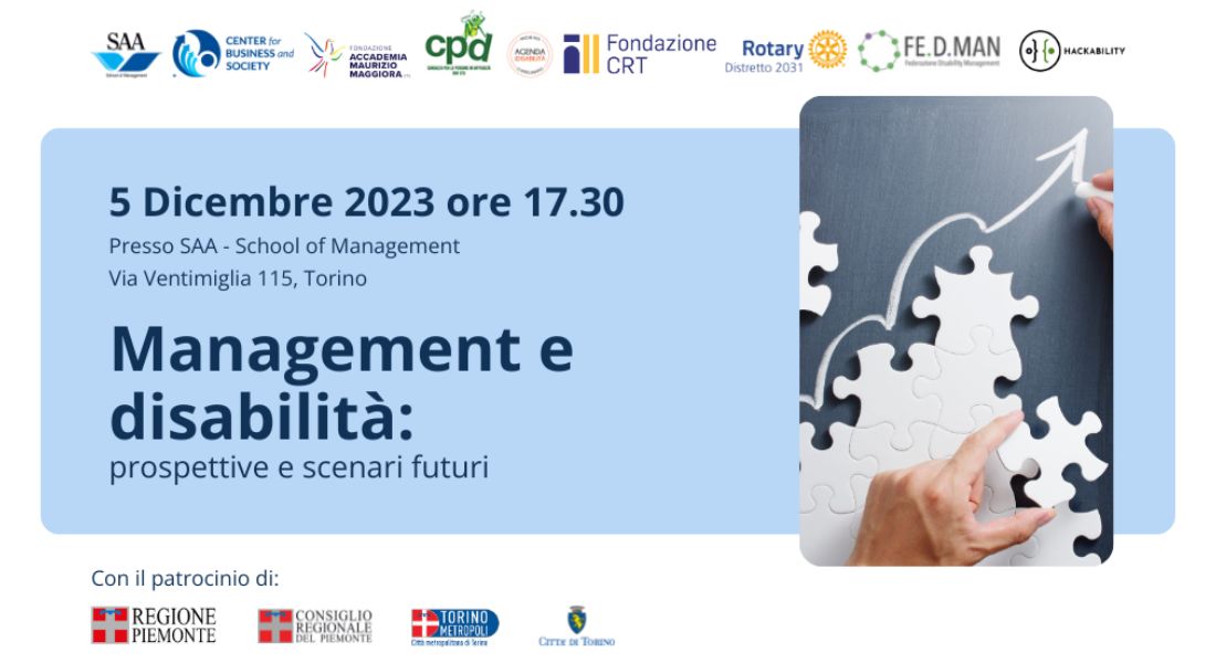 SAA school of Management e Consulta per la Persone in Difficoltà il 5 dicembre a partire dalle ore 17.00 organizzano l’evento dal titolo Management e Disabilità: prospettive e scenari futuri.