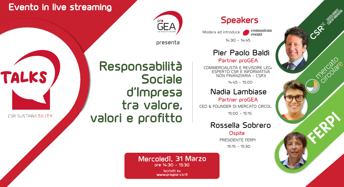 Mercoledì 31 marzo dalle 14.30 si terrà online il primo webinar gratuito del ciclo ProGea Talks dedicato al tema della responsabilità sociale d’impresa.
