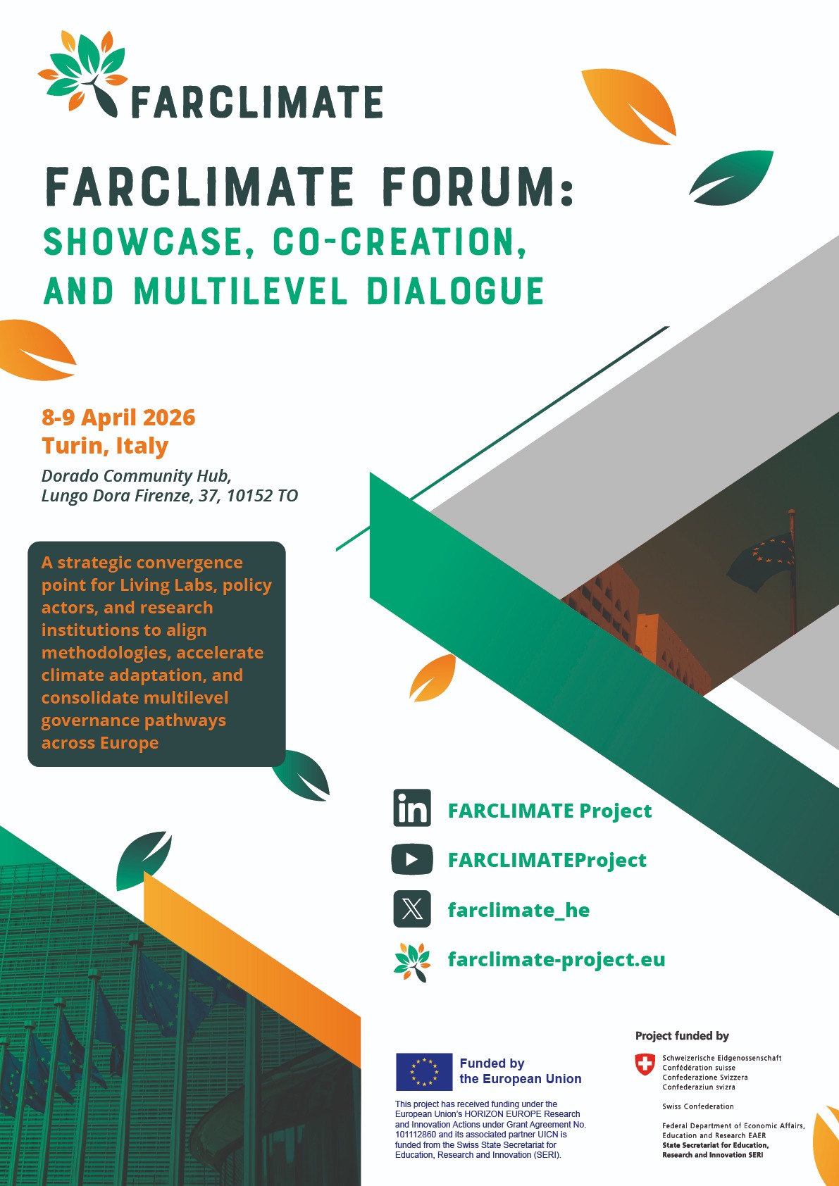 L’8 e 9 aprile Torino diventa punto di riferimento europeo per il confronto su resilienza climatica, innovazione territoriale e sperimentazione partecipata. Presso il Community Hub DORADO (Lungo Dora Firenze 27) si terrà il FARClimate Forum, 5° General Assembly del progetto Horizon Europe – Research and Innovation Action (HORIZON-MISS-2022-CLIMA-01-04).