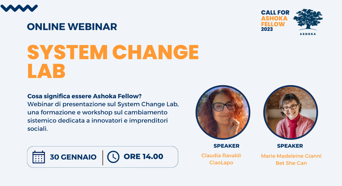 Lunedì 30 gennaio alle ore 14:00 si terrà il webinar di presentazione del System Change Lab, la giornata di formazione e workshop sul cambiamento sistemico dedicata a innovatori e imprenditori sociali che potrebbero entrare a far parte della corte di potenziali candidati alla prestigiosa Fellowship di Ashoka.